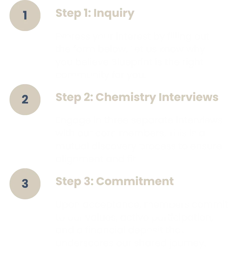 The Blueprint Community is built on the strength of purpose-driven entrepreneurs united by a shared commitment to amplify their impact. Membership with a selective process to foster a trusted circle of professionals who have navigated the entrepreneurial journey often marked by success, yet shadowed by isolation or a search for deeper meaning.